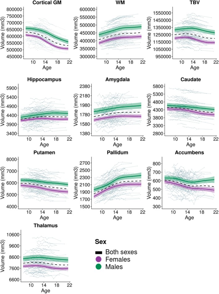 Developmental trajectories for global brain volume and subcortical regions. Trajectories (with 95% confidence intervals) are plotted separately for females, males, and both sexes, and overlaid on individual trajectories for each participant. Cortical GM = cortical grey matter. WM = white matter. TBV = total brain volume.